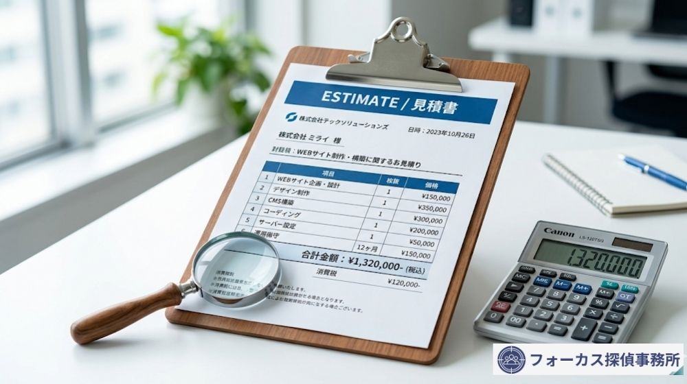 面談で調査方針が固まったら、お見積りの提示へ進みます。 ここで探偵選びの重要な注意点があります。それは、見積りを見る際に「総額の安さ」だけを見て、「安いから」と即決するのは非常に危険だということです。業界の一部には、初期費用を極端に安く見せかけ、調査開始後に「機材費」「車両代」「深夜割増」といった名目で、後から高額な追加料金を請求する悪質な業者が存在します。